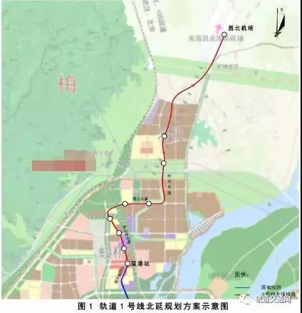 根據規劃方案,優化調整后,地鐵1號線北延線南起雙港站,沿廬山中大道、昌北大道、經開大道、規劃贛新大道北至昌北機場站,北延線全長16.62公里,共設地鐵站8座,平均站間距約2.1公里。