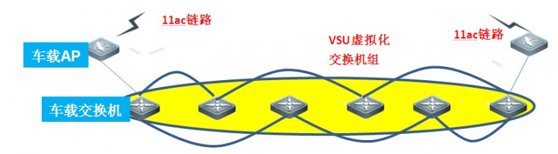 VSU虛擬化:將各車廂交換機虛擬成一個交換機單元,可進行統(tǒng)一管理,策略統(tǒng)一下發(fā);通過環(huán)網(wǎng)實現(xiàn)有線鏈路冗余備份。