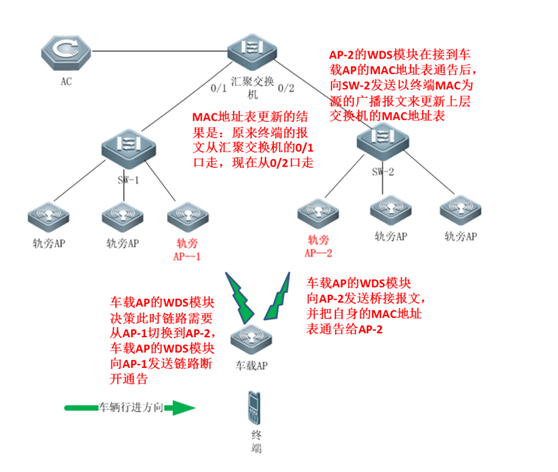 列車移動過程中,AC端能夠根據(jù)車載AP的信號強度、鏈接速率等參數(shù),自動切換到信號較好的AP上。