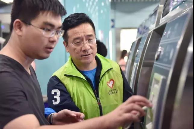 2018年國慶期間,周新(右)在京港地鐵運營的4號線動物園站擔任志愿者。