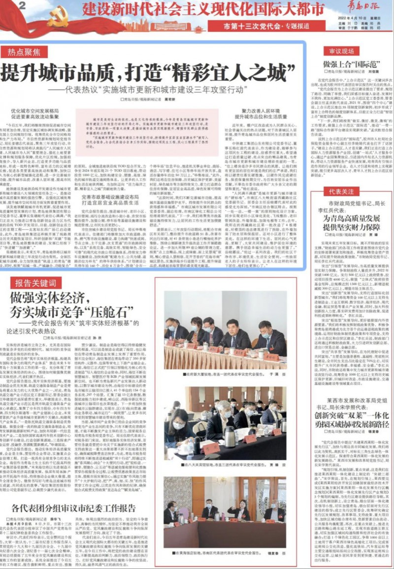 “實施城市更新和城市建設三年攻堅行動,持續提升宜居宜業宜游水平”被寫入黨代會報告。在青島市第十三次黨代會上,與會代表結合自身工作實際,圍繞這項民生工程、民心工程展開了熱烈討論。 談及地鐵賦能城市有機更新、促進城市更高質量轉型發展的計劃,青島地鐵集團有限公司黨委書記、董事長張建剛代表在接受青島日報記者采訪時,信心滿滿地表示,未來五年,青島地鐵將以城市更新和城市建設三年攻堅行動為契機,全面匹配城市戰略,全力加快推進“軌道上的青島”建設,讓更多的人工作和生活在地鐵兩側,為加快邁向“活力海洋之都、精彩宜人之城”貢獻地鐵力量。