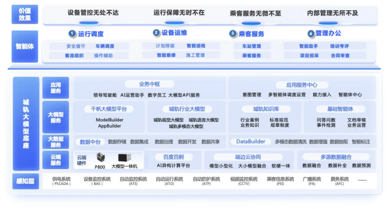 方案依托百度智能云千帆?模型平臺和交通多模態?模型能?,構建了城軌?模型底座,提供從算?資源管理到多模態數據處理再到?模型開發及模型訓練,以及企業級?模型開發的全鏈路能?,可?效?撐運?調度、設備運維、乘客服務與職能辦公四?城軌核?場景的智能體建設。