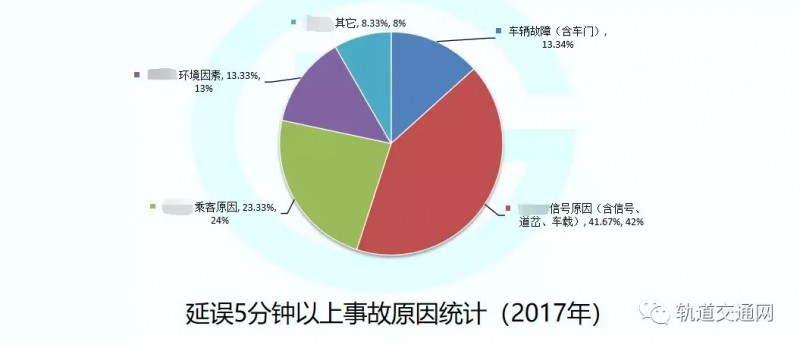 據(jù)了解,2017年北京地鐵共發(fā)生延誤5分鐘以上事故60件,同比減少16件,兩次延誤5分鐘以上事故間平均車(chē)公里同比增長(zhǎng)29%。從造成延誤的原因分析,其中,信號(hào)專(zhuān)業(yè)所占比例為41.7%,乘客原因占比23.3%,車(chē)輛故障占比13.3%,環(huán)境影響占比13.3%。由此可以看出,因信號(hào)、車(chē)輛原因影響列車(chē)5分鐘故障占比較重,占比達(dá)55%。其中,因信號(hào)原因影響列車(chē)5分鐘故障共計(jì)27件,造成故障的主要原因集中在道岔及轉(zhuǎn)轍設(shè)備、車(chē)載設(shè)備、聯(lián)鎖和計(jì)軸設(shè)備。因車(chē)輛原因影響列車(chē)5分鐘故障共計(jì)7件,造成故障的主要原因集中在控制回路、牽引系統(tǒng)、輔助電源系統(tǒng)、車(chē)門(mén)系統(tǒng)設(shè)備上。