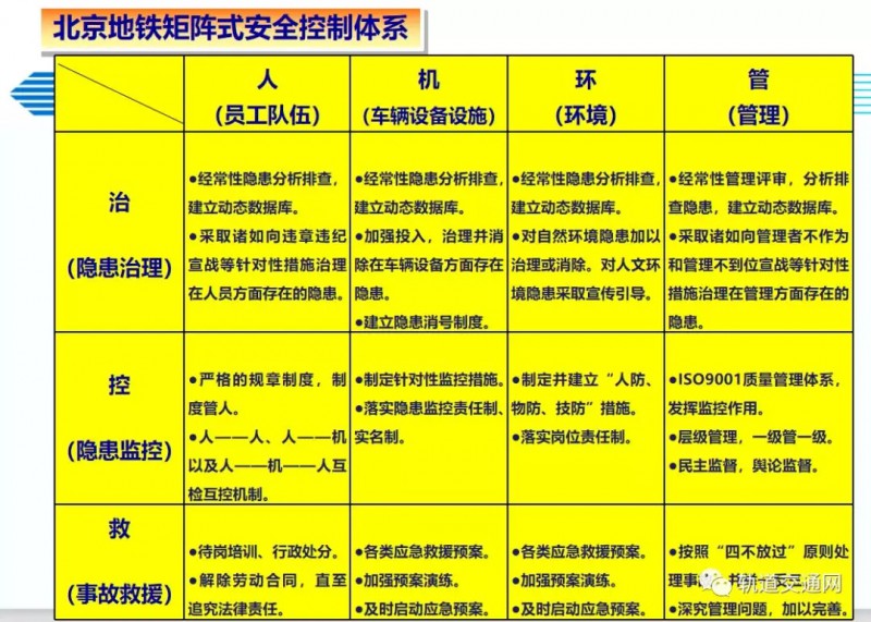 同時(shí),北京地鐵通過(guò)轉(zhuǎn)變管理理念,總結(jié)近五十年運(yùn)營(yíng)管理經(jīng)驗(yàn)形成了一套完整的安全管理體系,并創(chuàng)造性的提出北京地鐵矩陣式安全控制體系,通過(guò)“治”、“控”、“救”三大途徑為員工隊(duì)伍、車(chē)輛設(shè)備設(shè)施、環(huán)境、管理筑起了一道有效防線。特別是在“治”上下功夫,努力治理或消除隱患,將隱患減少到最低程度,安全基礎(chǔ)不斷強(qiáng)化。