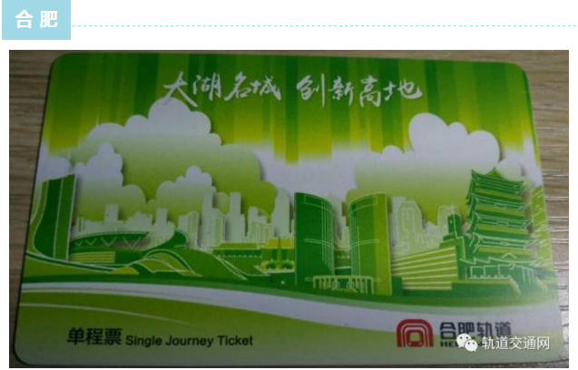 合肥地鐵單程票卡正面以綠色為主基調,票面上方寫有“大湖名城 創新高地”。票面圖案多為合肥地標性建筑,包括安徽省廣電中心、明教寺、奧體中心等。合肥單程票價起步價 2 元可乘 8 公里;乘坐 8 公里以上,14 公里(含)以內的 3 元;乘坐 14 公里以上,21 公里(含)以內的 4 元;乘坐 21 公里以上,29 公里(含)以內的 5 元;乘坐 29公里以上的,每增加 9 公里,加收 1 元。
