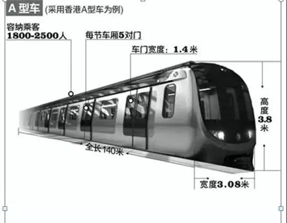 標準A型車車寬3米,車高3.8米,車體有效長度22.1米,一般為8者6節編組,軸重16t,單向小時最大客運量4.5-7.5萬人。