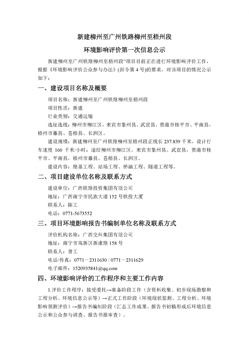 近日,廣西鐵路投資集團有限公司官網(wǎng)發(fā)布了《新建柳州至廣州鐵路柳州至梧州段環(huán)境影響評價第一次信息公示》。