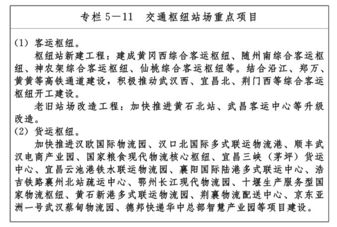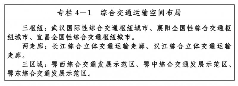 ——三樞紐:打造武漢國際性綜合交通樞紐城市和襄陽、宜昌全國性綜合交通樞紐城市,充分發揮中心城市輻射帶動作用,有力支撐武漢城市圈、“襄十隨神”城市群、“宜荊荊恩”城市群高質量發展。武漢重點提升全球直達能力,支持黃岡—鄂州—黃石全國性綜合交通樞紐城市融入武漢樞紐布局,打造樞紐集群,加快建成中部地區國際門戶,重點打造航空門戶樞紐、長江中游航運中心、全國鐵路路網中心、全國高速公路網重要樞紐。襄陽重點強化中部地區重要鐵路客貨中轉樞紐、漢江航運中心、國家生產服務型物流樞紐等功能,宜昌重點強化三峽航運中轉中心、公鐵水跨區域聯運中心、國家港口型物流樞紐等功能。結合其它城市發展,發揮比較優勢,打造一批區域性綜合交通樞紐,形成“一核兩心多點”樞紐布局。