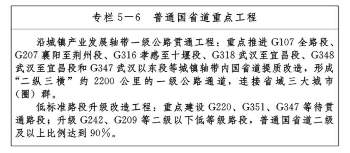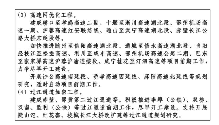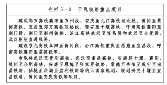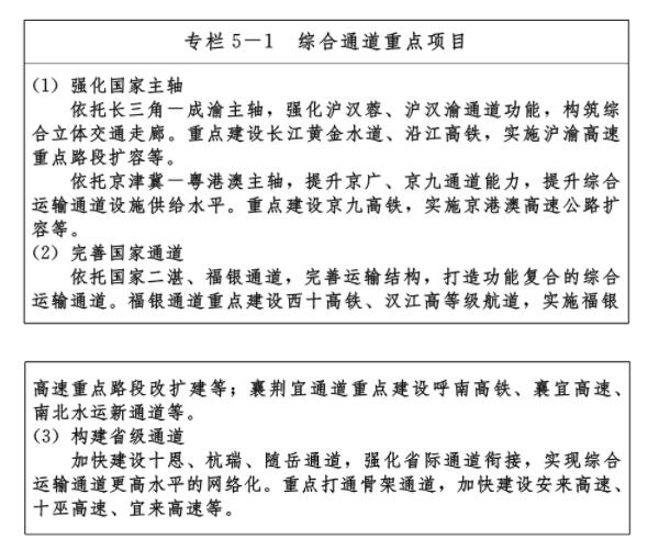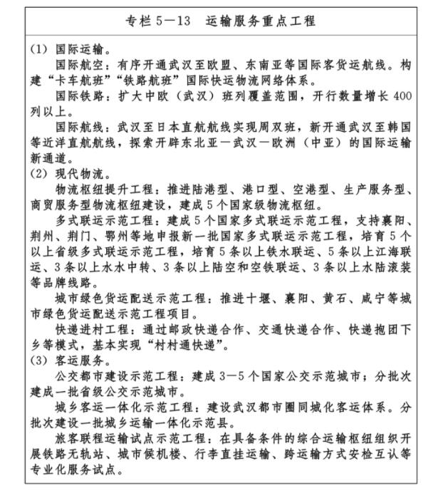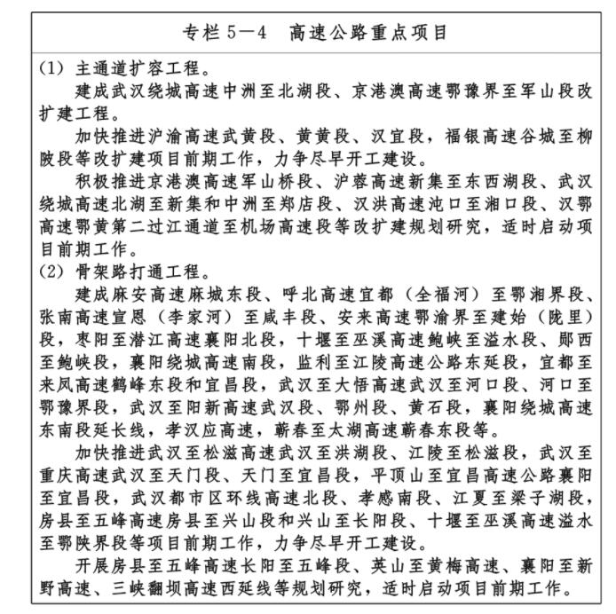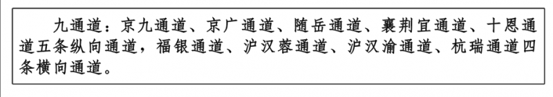 ——九通道:優化、提升、完善南北方向京九、京廣、隨岳、襄荊宜、十恩和東西方向福銀、滬漢蓉、滬漢渝、杭瑞等“五縱四橫”九條綜合交通運輸大通道,形成與城鎮發展軸和重要產業帶有機銜接、溝通周邊城市群和各大經濟區、聯通國際的綜合運輸通道布局。