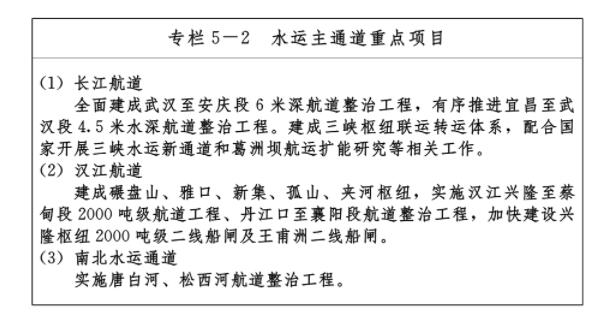 ——兩走廊:打造長江、漢江綜合立體交通運輸走廊,重點發揮黃金水道優勢,優化完善各交通方式布局,支撐和引導優勢資源和產業向“兩走廊”集聚,聯動長江經濟帶、漢江生態經濟帶一體化發展。長江綜合立體交通運輸走廊重點推進長江航道系統治理,統籌沿江港口功能布局,推進快速通道建設,提升過江通道能力。漢江綜合立體交通運輸走廊重點推進漢江梯級開發和系統治理,推動沿江港口干支聯動,完善各交通方式網絡。