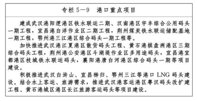 積極推進武漢長江中游航運中心建設,加快推動沿江港口優化整合,促進上下游、干支流港口協同聯動發展,促進港產城協同發展。以武漢港為核心,黃石港、宜昌港、荊州港、襄陽港為重點,加強沿江主要港口核心港區的規模化、專業化碼頭建設以及公用碼頭的改造升級,強化港口樞紐輻射能力,拓展港口綜合服務功能,加快構建輻射中西部地區、對接國際航運市場的港口集群,將武漢港打造為中部地區樞紐港。有序推進長江、漢江沿線重要港口專業化、特色化碼頭建設,發揮港口對產業的支撐服務作用。