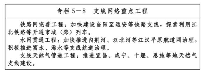 加強資源富集區、人口相對密集、脫貧地區開發性鐵路支線鐵路建設,支持大型工礦企業新建或改建鐵路專用線,拓展鐵路服務范圍。有序實施一批市域(郊)鐵路,探索利用既有鐵路開通市域(郊)列車,完善都市圈軌道交通網絡。重點推進江漢平原水網貫通工程,積極支持長江、漢江及庫區支流航道建設,打造干支銜接的江河聯運通道。加快推進省內天然氣支線管道建設,拓展天然氣供氣服務覆蓋范圍。