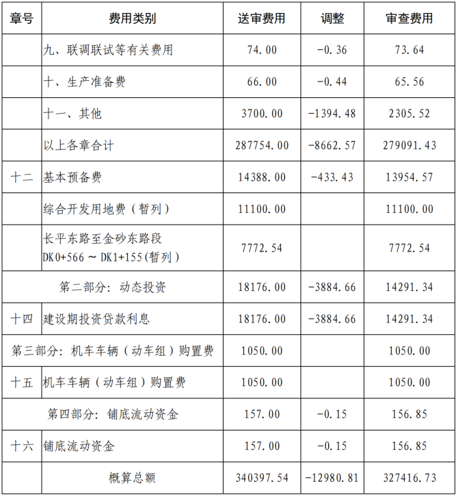 (四)征地拆遷按照《國家土地法》和廣東省關于征地拆遷相關規定分析計列,結合可行性研究批復意見,本階段綜合開發用地費用暫按1.11億元計列。經審查,核定初步設計概算為327416.73萬元。