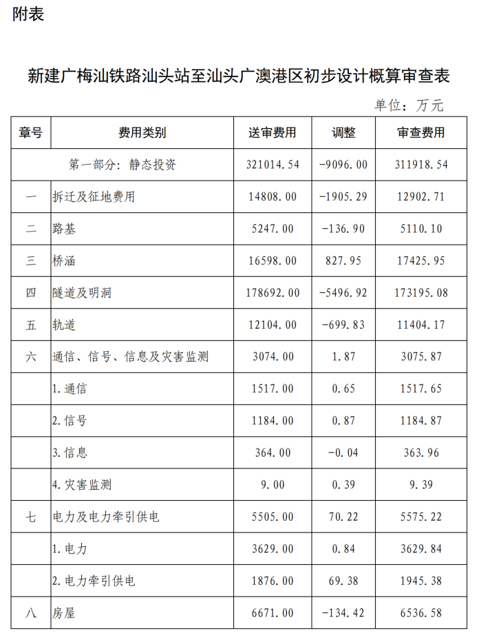 附表:新建廣梅汕鐵路汕頭站至汕頭廣澳港區初步設計概算審查表