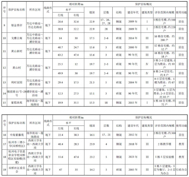 沿線主要分布有住宅、學校、行政辦公等環(huán)境保護目標,其中聲環(huán)境評價范圍內共有5處聲環(huán)境保護目標(見表1);振動環(huán)境評價范圍內共有19處振動環(huán)境保護目標(見表2);排風亭大氣評價范圍內有4處環(huán)境空氣環(huán)境保護目標(包含于聲環(huán)境保護目標);沿線不涉及自然保護區(qū)、風景名勝區(qū)、世界自然遺產地、生態(tài)保護紅線和基本農田。工程涉及杭州海塘,下穿建設控制地帶范圍180m;下穿蕭山越王遺址埋藏區(qū)397m;以隧道形式穿越錢塘江飲用水源準保護區(qū)3500m。