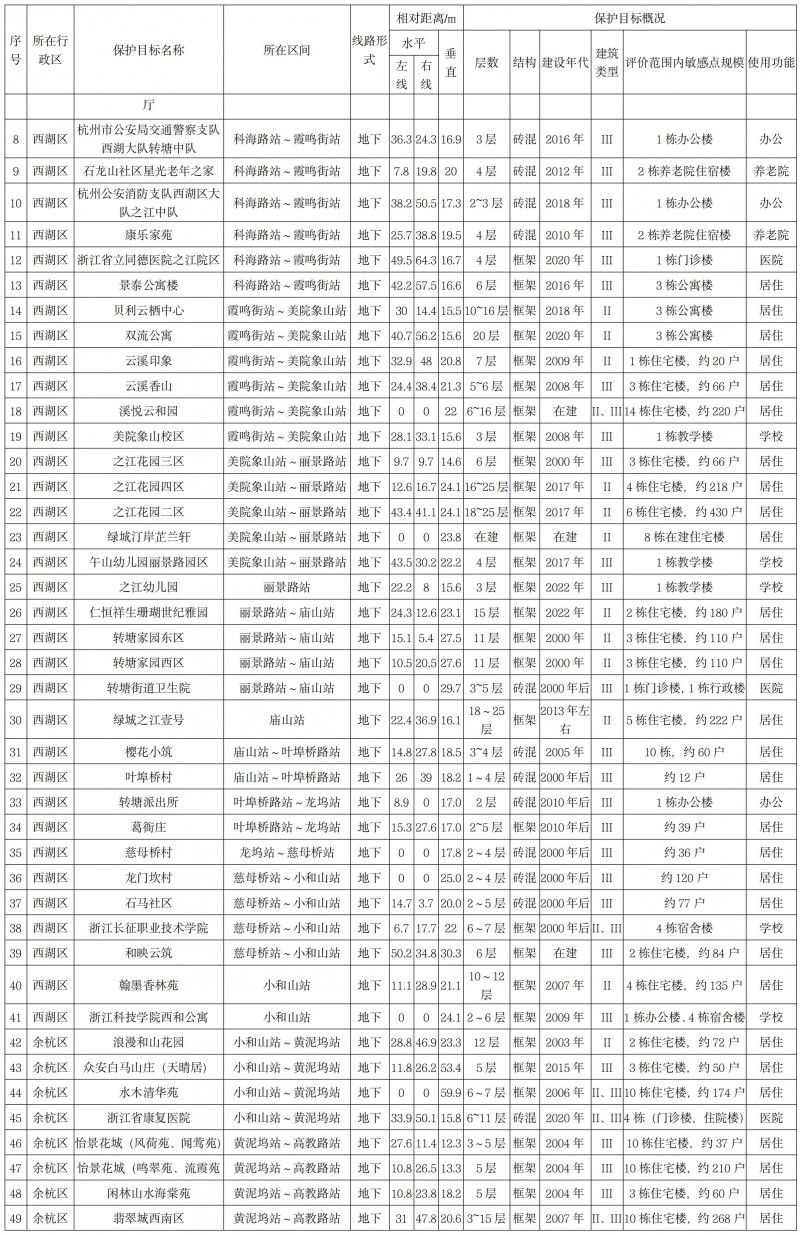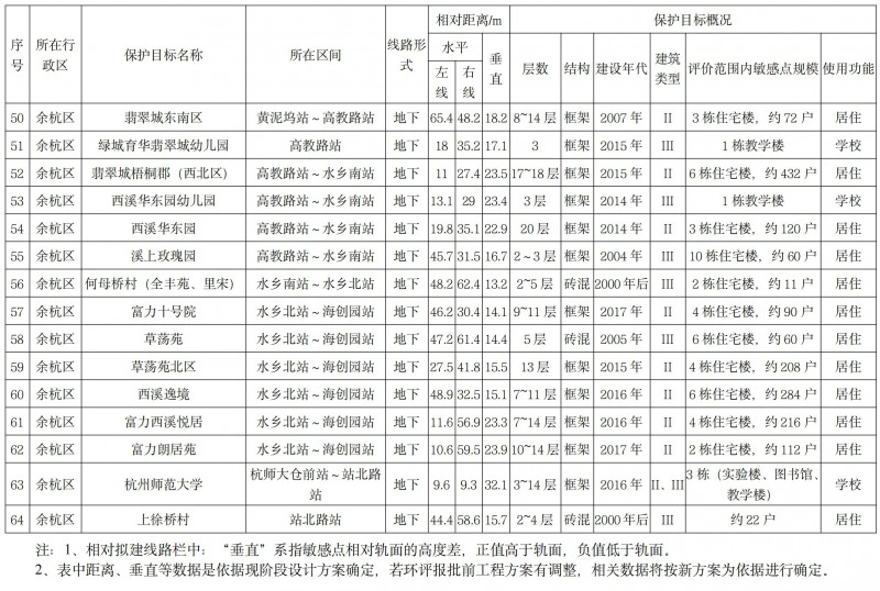 沿線聲環境評價范圍內共有6處保護目標,其中居民點5處,醫院1處(見下表1)。振動環境評價范圍內共有64處現狀保護目標,其中住宅45處,學校9處,醫院3處,行政辦公4處,養老機構3處(見下表2)。排風亭大氣評價范圍內有3處大氣環境保護目標(同表1)。生態環境評價范圍內有西山國家森林公園,杭州海塘省級文物保護單位以及古蕩-老和山-余杭街道歷代古墓葬重點保護區。新建1座主變電所周邊無電磁環境保護目標。項目不涉及飲用水水源保護區。