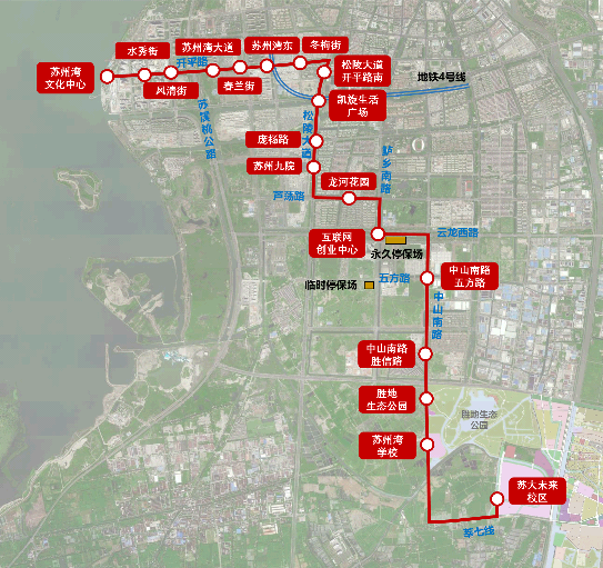 T2線二期工程線路長約8.6km,設(shè)7座車站,新建2座側(cè)式站(蘇州灣學(xué)校站、蘇大未來校區(qū)站),其余車站均改造或利用既有公交車站;于云龍西路、云龍西路復(fù)線之間地塊增設(shè)1處永久停保場,占地面積約34000m2。