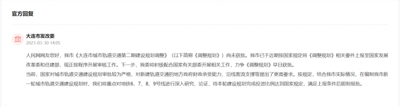 人民網(wǎng)網(wǎng)友您好,我市《大連市城市軌道交通第二期建設(shè)規(guī)劃調(diào)整》(以下簡(jiǎn)稱(chēng)《調(diào)整規(guī)劃》)尚未獲批。我市已于近期按國(guó)家規(guī)定將《調(diào)整規(guī)劃》相關(guān)要件上報(bào)至國(guó)家發(fā)展改革委和住建部,現(xiàn)正按程序開(kāi)展審核工作。下一步,我委將積極配合國(guó)家有關(guān)部委開(kāi)展相關(guān)工作,力爭(zhēng)《調(diào)整規(guī)劃》早日獲批。