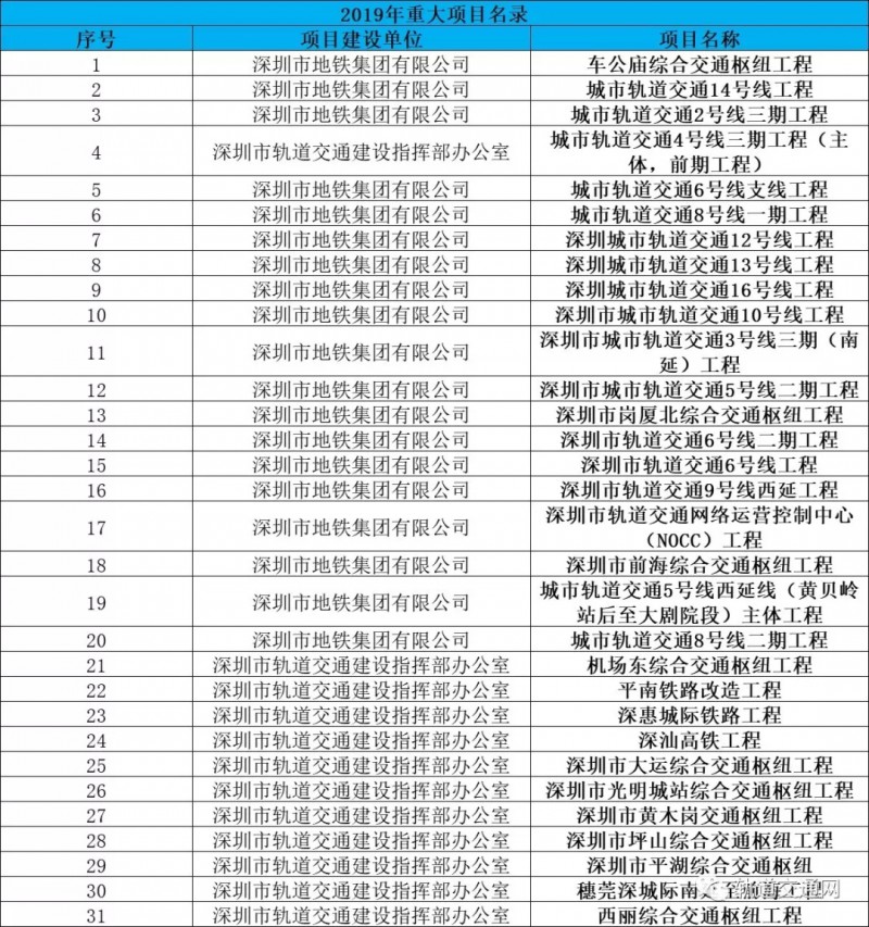 近日,深圳市人民政府發布《深圳市2019年重大項目計劃》。2019年,深圳共安排471個重大項目計劃,其中31個為軌道交通項目。