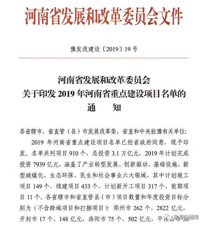 近日,河南省重點項目建設網發布《關于印發2019年河南省重點建設項目名單的通知》。名單共列項目910個,總投資3.1萬億元,2019年計劃完成投資7939億元,涵蓋了產業轉型發展、創新驅動、基礎設施、新型城鎮化、生態環保、民生和社會事業六大領域,其中計劃竣工項目149個、續建項目433個、計劃新開工項目317個、前期項目11個。