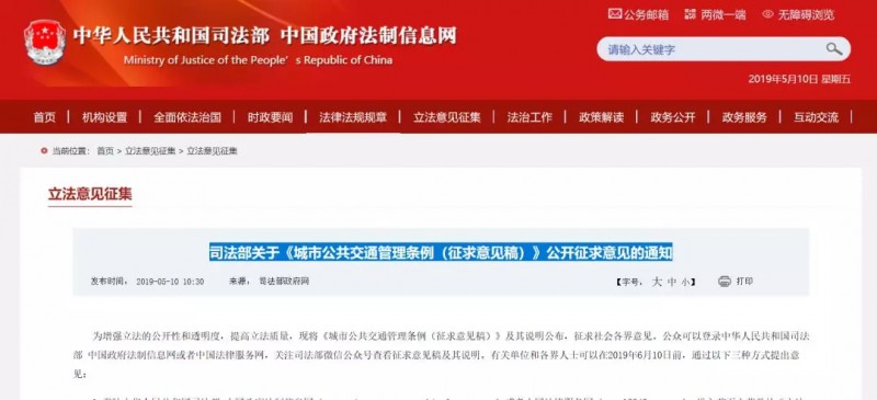 為增強立法的公開性和透明度,提高立法質量,現將《城市公共交通管理條例(征求意見稿)》及其說明公布,征求社會各界意見。公眾可以登錄中華人民共和國司法部中國政府法制信息網或者中國法律服務網,關注司法部微信公眾號查看征求意見稿及其說明。有關單位和各界人士可以在2019年6月10日前,通過以下三種方式提出意見: