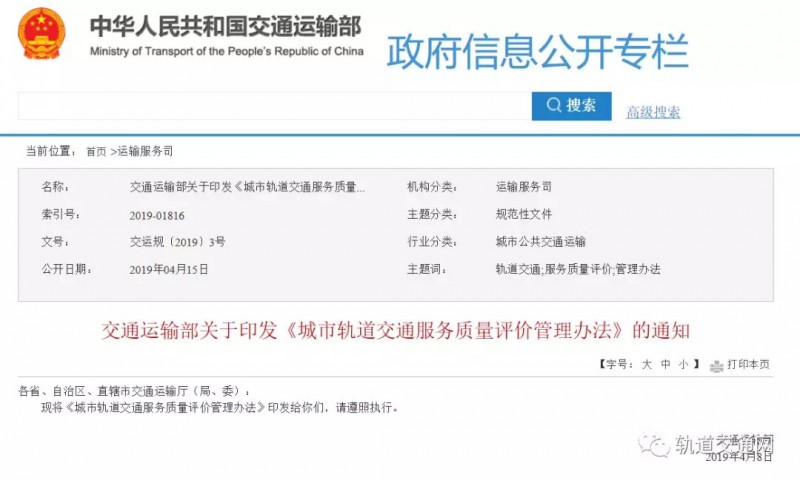 為貫徹落實《國務(wù)院辦公廳關(guān)于保障城市軌道交通安全運行的意見》(國辦發(fā)〔2018〕13號,以下簡稱《意見》)和《城市軌道交通運營管理規(guī)定》(交通運輸部令2018年第8號,以下簡稱《規(guī)定》)有關(guān)要求,指導各地做好城市軌道交通服務(wù)質(zhì)量評價工作,日前,交通運輸部印發(fā)《城市軌道交通服務(wù)質(zhì)量評價管理辦法》(交運規(guī)〔2019〕3號,以下簡稱《辦法》),將于2019年7月1日起施行。同時,為規(guī)范評價程序、評價指標和評分規(guī)則等的具體要求,交通運輸部辦公廳同步印發(fā)了《城市軌道交通服務(wù)質(zhì)量評價規(guī)范》(交辦運〔2019〕43號,以下簡稱《評價規(guī)范》)。現(xiàn)就《辦法》和《評價規(guī)范》的出臺背景及主要內(nèi)容解讀如下: