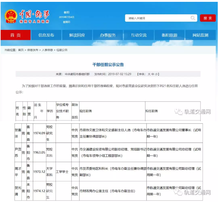 7月2日,中共衡陽市委組織部發布干部任前公示,在該次《任前公示》中,列出了衡陽市軌道交通發展有限公司董事長、總經理、副總經理等職位的擬任用人員名單。