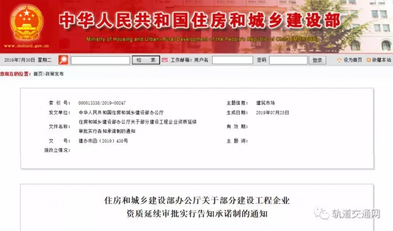 一、自2019年9月1日起,我部負責的工程勘察、工程設計、建筑業企業、工程監理企業資質延續審批實行告知承諾制,不再委托各省級住房和城鄉建設主管部門實施資質延續審查工作。