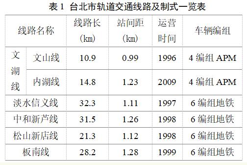 以我國(guó)臺(tái)北為例,城區(qū)面積272km2,人口268萬,GDP為5412.65億(2017年),其經(jīng)濟(jì)條件和社會(huì)基礎(chǔ)設(shè)施建設(shè)均較好,該市首條軌道交通線路即選擇了APM,與其他地鐵線路一起,共同組成了臺(tái)北市軌道交通線網(wǎng)(見表1)。