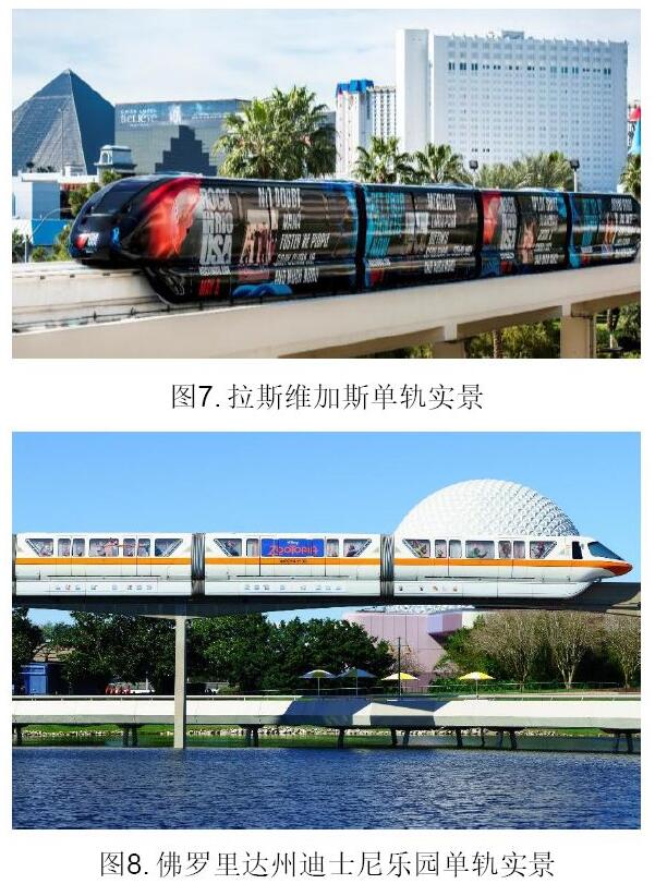 拉斯維加斯是世界著名的以賭博業(yè)為中心的旅游、購物、度假城市,通過7個(gè)車站,6.3km單軌線路,串聯(lián)了城市中心:度假酒店、賭場(chǎng)、夜場(chǎng)、酒吧、體育場(chǎng),線路自1995年開通,年客運(yùn)量約400萬人次(見圖7)。此外,據(jù)不完全統(tǒng)計(jì),全球有30余個(gè)主題公園內(nèi)建設(shè)有跨座式單軌,作為園區(qū)內(nèi)部的交通方式(見圖8)。