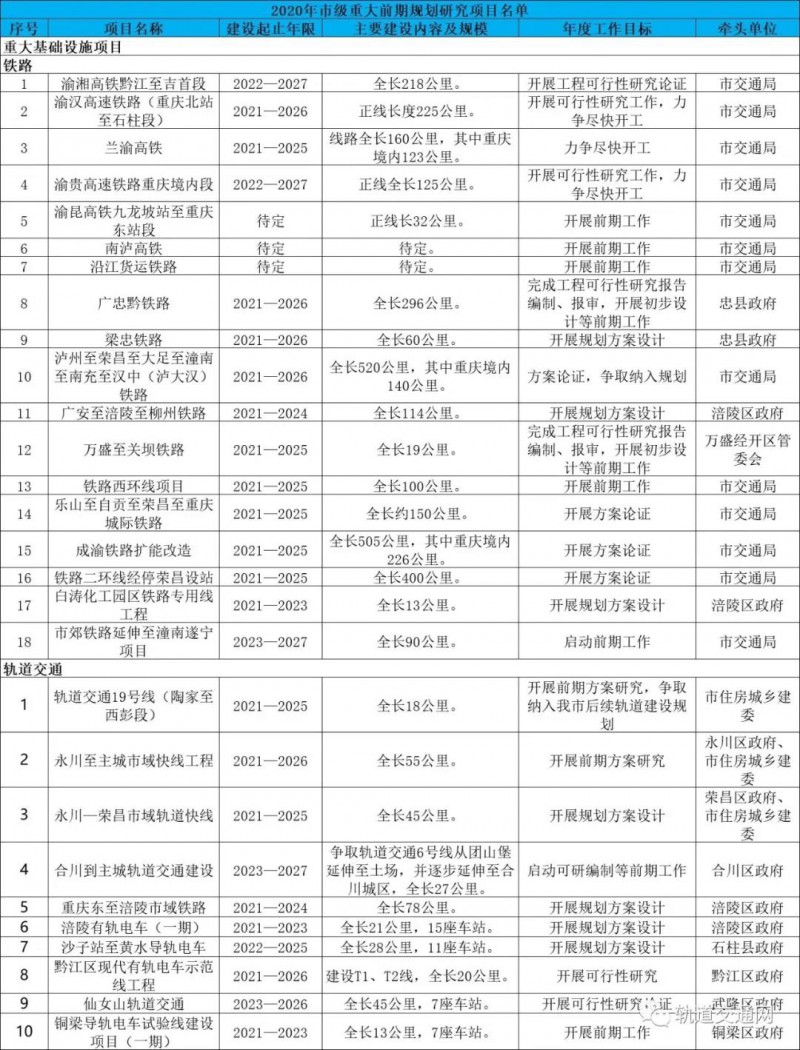 2020年重慶市級重大項目包括重大建設項目、重大前期規劃研究項目、重大招商項目。其中:重大建設項目924個,估算總投資約2.72萬億元,年度計劃完成投資3445億元;重大前期規劃研究項目261個,估算總投資約1.13萬億元;重大招商項目100個,估算總投資約5255億元。涉及軌交領域的共計60項,包含32項重大項目和28項重大前期規劃研究項目。具體情況如下表所示: