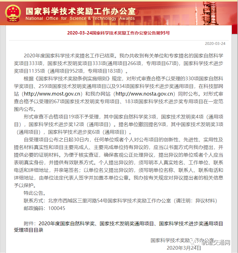 2020年度國(guó)家自然科學(xué)獎(jiǎng)、國(guó)家技術(shù)發(fā)明獎(jiǎng)通用項(xiàng)目、國(guó)家科學(xué)技術(shù)進(jìn)步獎(jiǎng)通用項(xiàng)目受理項(xiàng)目(軌道交通領(lǐng)域)