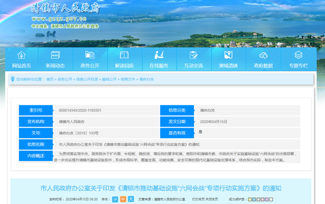 4月15日,清鎮市政府公布《清鎮市推動基礎設施“六網會戰”專項行動實施方案》。方案顯示,2019-2022年清鎮市“六網會戰”計劃投資260.1億元左右。其中2019年計劃投資25.35億元,2020-2022年計劃投資234.75億元。