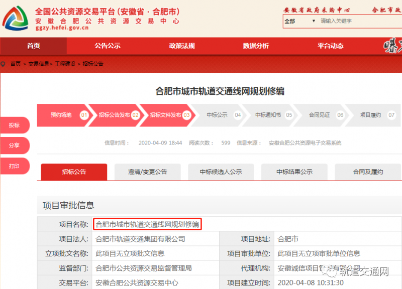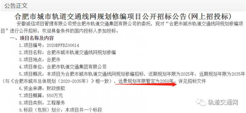 近日,從安徽合肥公共資源交易中心獲悉,合肥市城市軌道交通線網規劃修編正在招標。
