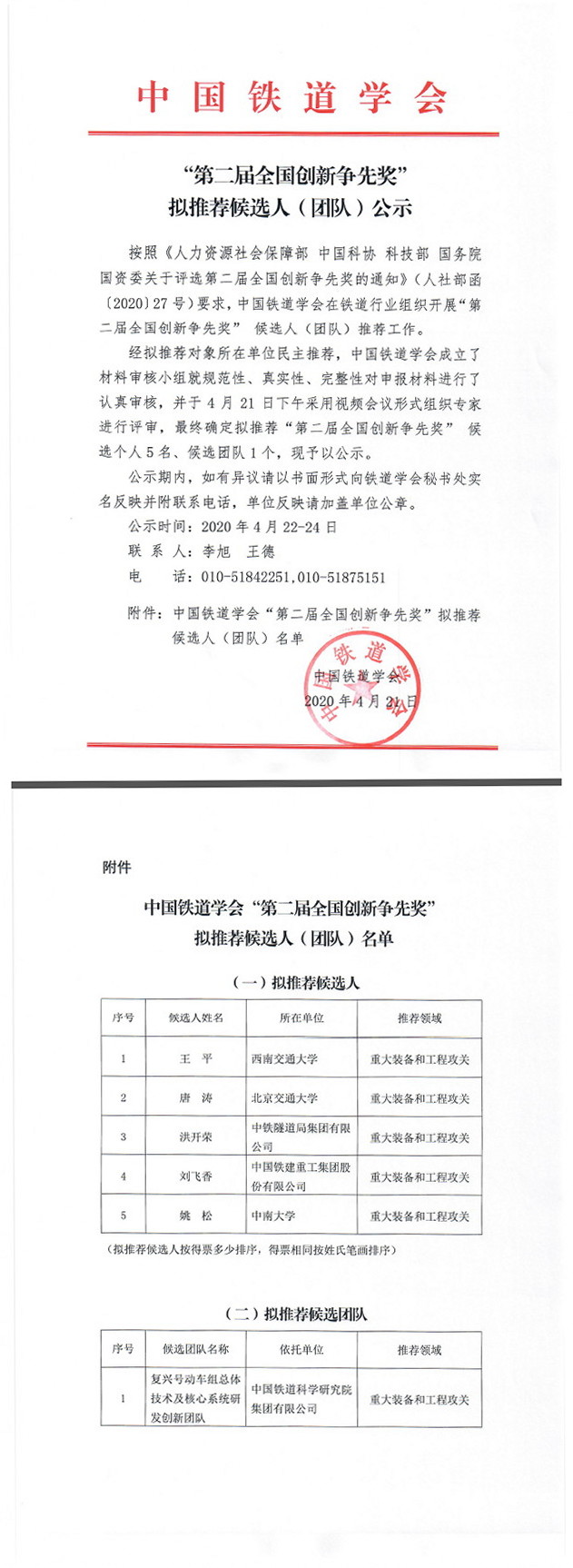 4月22日,中國鐵道學會發布“第二屆全國創新爭先獎”擬推薦候選人(團隊)公示。