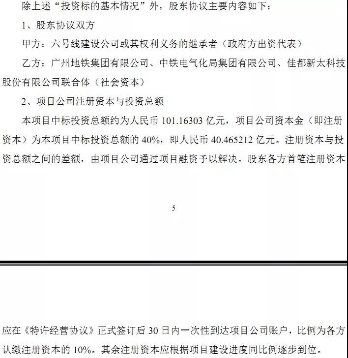 近期,廣州地鐵(聯(lián)合體牽頭人)、中鐵電氣化局(聯(lián)合體成員)與佳都科技(聯(lián)合體成員)組成的聯(lián)合體作為社會資本收到長沙軌道交通6號線項目中標通知書,中標投資總額約人民幣101.16303億元,根據(jù)長沙市人民政府的相關(guān)批復,采取政府與社會資本合作方式實施本項目,由政府方出資代表與中標社會資本按照約定股權(quán)比例成立項目公司,項目公司資本金為中標投資總額的40%。其中公司對項目公司的出資比例為15%。