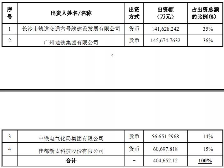 廣州地鐵集團、中鐵電氣化局集團、佳都科技擬與長沙市軌道交通六號線建設發(fā)展有限公司共同出資設立長沙穗城軌道交通有限公司(最終名稱以工商登記為準),項目公司注冊資本為40.465212億元人民幣。