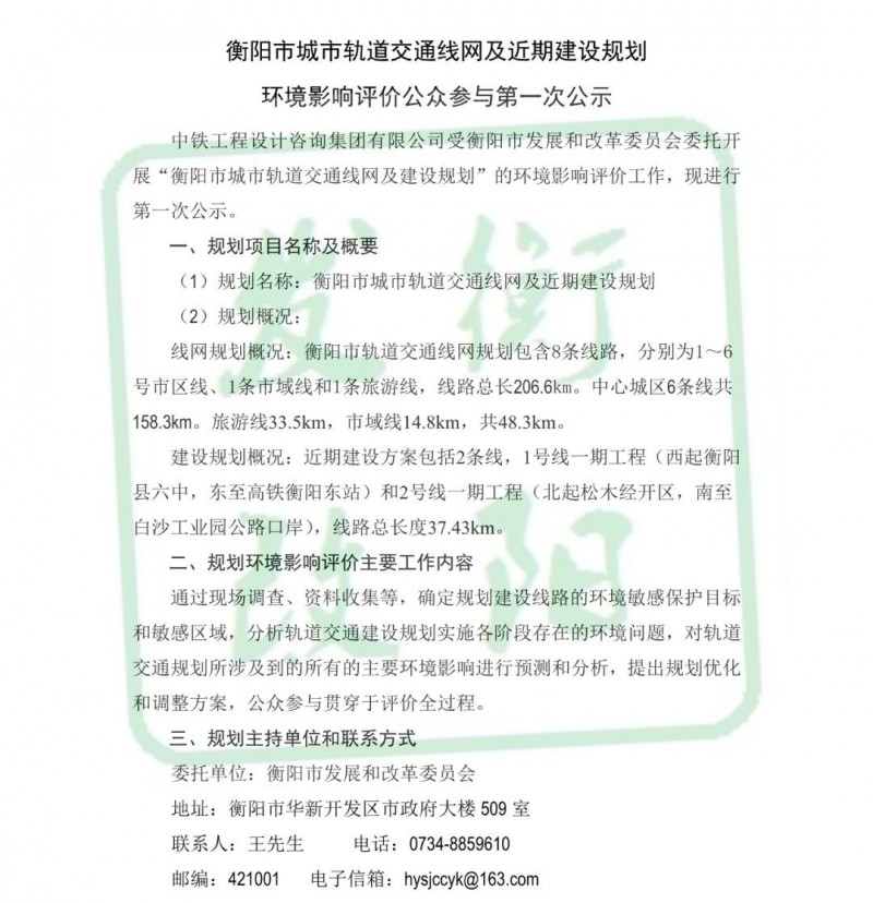 6月20日,衡陽市發改委官方公眾號發布了衡陽市城市軌道交通線網及近期建設規劃環境影響評價公眾參與第一次公示。