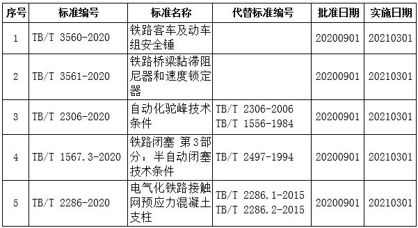 國家鐵路局批準發布以下5項鐵道行業標準,現予以公布。標準由中國鐵道出版社有限公司出版發行。