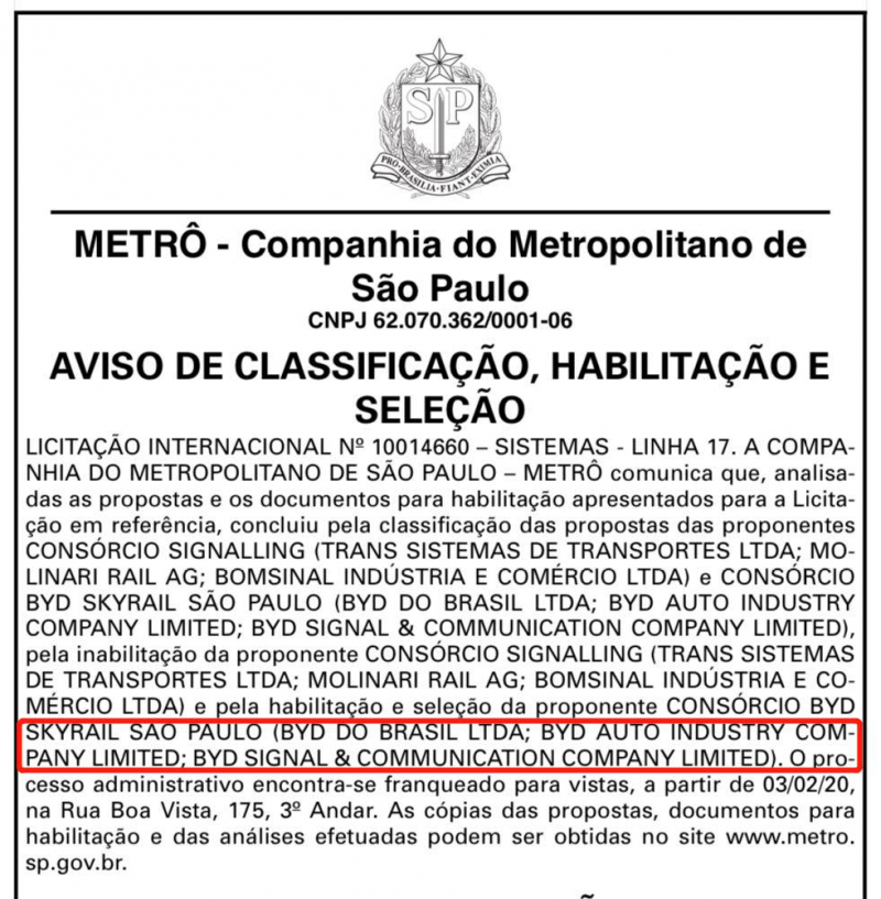 圣保羅州政府公告截圖:2020年2月1日,比亞迪中標巴西圣保羅市軌道交通17號線項目。