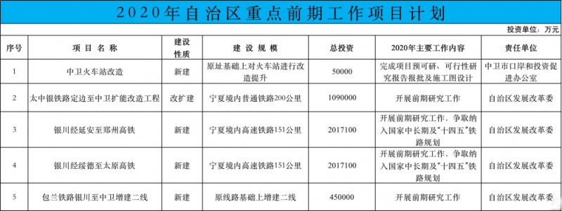 近日,寧夏自治區發改委印發《2020年自治區重點項目投資計劃》的通知。其中,2020年重點建設項目共有80項,總投資約2268 億元,2020年計劃投資約510 億元;2020年重點預備項目共計27項,總投資約 756.5億元,2020年計劃投資約52.58億元;2020年重點前期共計37項,總投資約 2101.9 億元。