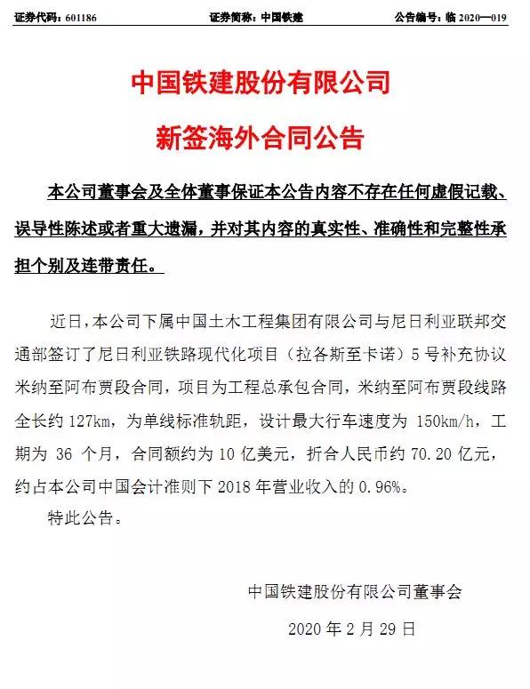 鐵建最新公告稱:旗下土木工程集團(tuán)有限公司與尼日利亞聯(lián)邦交通部簽訂了尼日利亞鐵路現(xiàn)代化項目(拉各斯至卡諾)5 號補(bǔ)充協(xié)議米納至阿布賈段合同,項目為工程總承包合同。