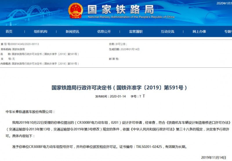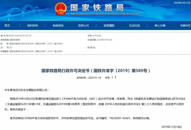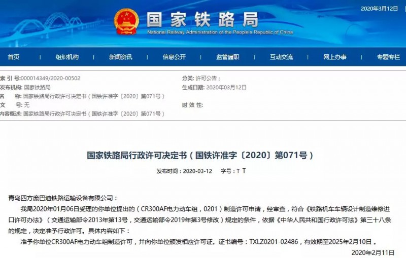 青島四方龐巴迪鐵路運(yùn)輸設(shè)備有限公司: 我局2020年01月06日受理的你單位提出的(CR300AF電力動(dòng)車組,0201)制造許可申請,經(jīng)審查,符合《鐵路機(jī)車車輛設(shè)計(jì)制造維修進(jìn)口許可辦法》(交通運(yùn)輸部令2013年第13號(hào),交通運(yùn)輸部令2019年第3號(hào)修改)規(guī)定的條件,依據(jù)《中華人民共和國行政許可法》第三十八條的規(guī)定,決定準(zhǔn)予行政許可。具體內(nèi)容如下: 準(zhǔn)予你單位CR300AF電力動(dòng)車組制造許可,并向你單位頒發(fā)相應(yīng)許可證。證書編號(hào):TXLZ0201-02486,有效期至2025年2月10日。 2020年2月11日