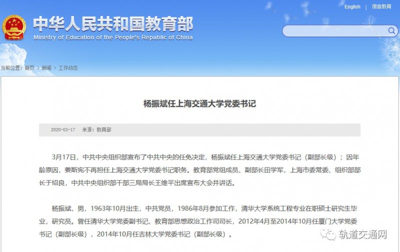 教育部網(wǎng)站消息,3月17日,中共中央組織部宣布了中共中央的任免決定,楊振斌任上海交通大學(xué)黨委書記(副部長級);因年齡原因,姜斯憲不再擔(dān)任上海交通大學(xué)黨委書記職務(wù)。教育部黨組成員、副部長田學(xué)軍,上海市委常委、組織部部長于紹良,中共中央組織部干部三局局長王維平出席宣布大會并講話。