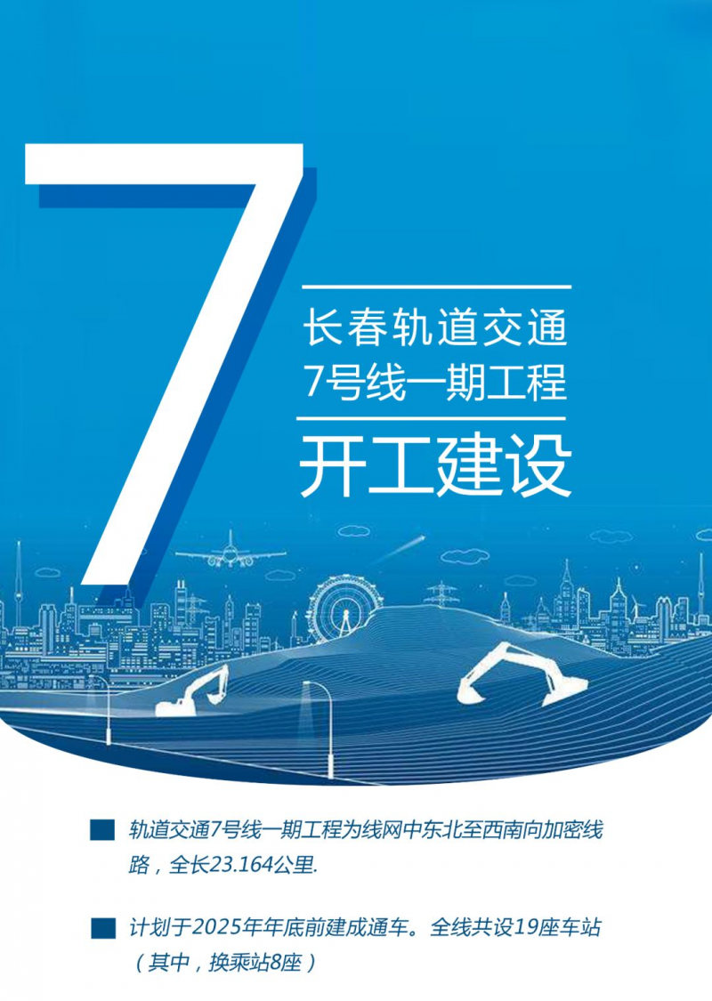 軌道交通7號線一期工程為線網中東北至西南向加密線路,全長23.164公里,起于東風大街與繞城高速交會處的汽車公園站,途經西四環路站、興安路站、安慶路站、飛躍廣場站、吉大四院站、南湖大路站、禮拜堂站、南湖廣場站、南湖新村站、工農廣場站、亞泰大街站、東嶺南街站、東南湖大路站、賽德廣場站、會展大街站、自由大路站、公平路站、終于東環路站,計劃于2025年年底前建成通車。全線共設19座車站(其中,換乘站8座)、19個區間,在繞城高速公路以西,東風大街以北靠山屯鎮設置車輛段一座。該線路加強了西南部汽開區與中心城區的聯絡,自南向北主要沿東風大街、南湖大路、東環城路敷設,沿線用地開發較為成熟,尤其是南湖大路、東環路段人口和崗位密集,客流量較大,是目前主要的擁堵地段。線路建成將引導長春城市格局合理發展。