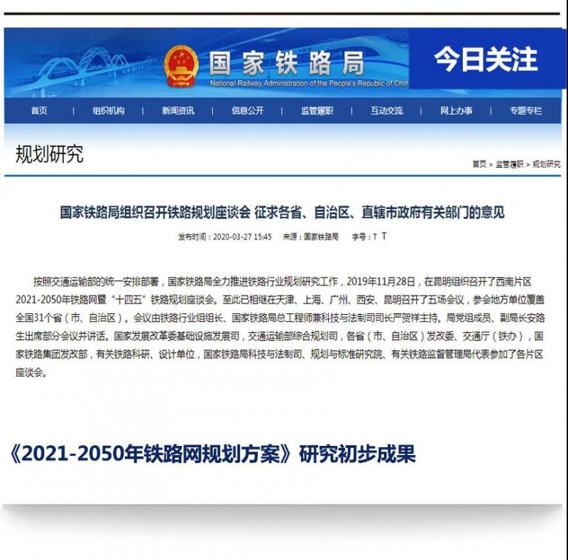 ?2019年10月15日,在天津組織召開2021-2050年鐵路網暨鐵路“十四五”(華北、東北片區)規劃方案座談會,北京市、天津市、河北省、山西省、內蒙古自治區、遼寧省、吉林省、黑龍江省、山東省、河南省發展和改革委(交通廳、鐵辦)、鐵設、中鐵設計有關負責同志參加會議。