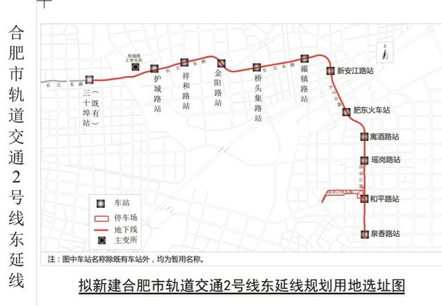 從公示內容來看,合肥市軌道交通2號線東延線項目起于2號線三十埠站,主要沿長江東路、規劃太子山路、規劃四頂山路敷設,止于泉香路,正線線路全長14.5公里,全地下敷設,共設置車站11座,主變電站1座,停車場一座。