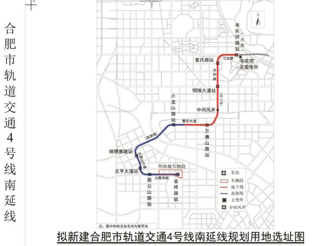 合肥市軌道交通4號線南延線起于金橋路站,主要沿大雁灣路、大潛山大道、繁華大道、永和路敷設,止于4號線豐樂河路站,正線線路全長13.97公里,設置車站8座,主變電所1座,區間風井1座,車輛段1座。