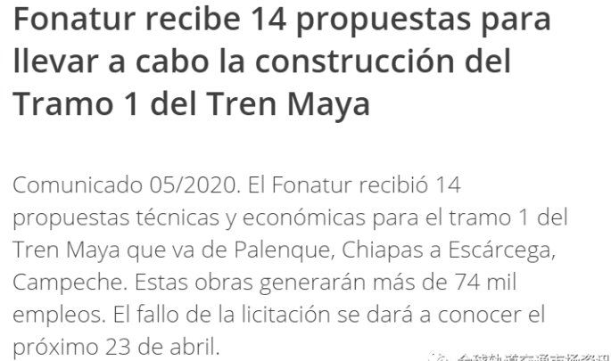 當地時間4月23日,國家旅游發展基金委宣布瑪雅鐵路第一標段的招標結果,中交建聯合體在競爭中脫穎而出,成為項目的中標商。項目價值約155.38億墨西哥比索。