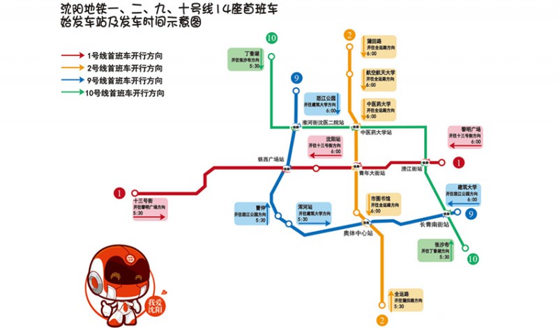 沈陽地鐵十號線兩端起止車站丁香湖站和張沙布站首班車發車時間均為5:30(開通當日除外),工作日早晚高峰行車間隔為6分7秒,雙休日高峰行車間隔為7分20秒。為方便乘客出行,結合十號線開通,沈陽地鐵充分研究線網客流分布、分析乘客出行規律,對線網首班車多點發車進行優化,將二號線五里河站開往全運路方向首班車,調整至市圖書館站,其他多點首班車發車車站不變(見附件1:沈陽地鐵一、二、九、十號線14座首班車始發站及發車時間示意圖)。十號線開通后,一、二、九號線部分車站首班車發車時間有所調整(見附件2:沈陽地鐵各線路首末班車時間表),線路兩端車站末班車發車時間與一、二、九號線保持一致,目前為23:00,請乘客留意各車站、特別是換乘站首末班車發車時間,合理安排行程。